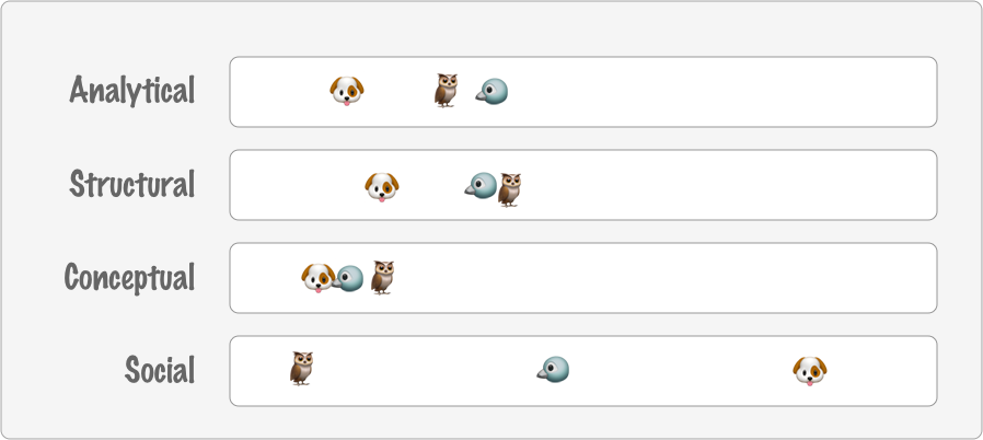 Since Emergenetics is very present in the company's culture, people started building charts showing where their team members fit in the analytical, structural, social and conceptual spectrums. Something like this: